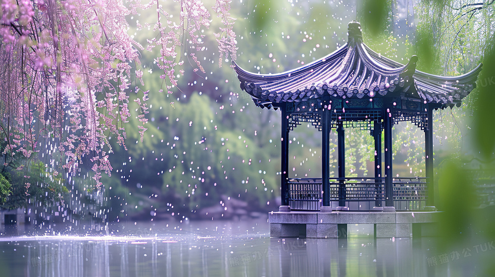 本作品内容为粉色清明雨中的凉亭插画, 格式为 jpg, 大小4 MB, 图片尺寸为2912 x 1632, 源文件无水印, 欢迎使用熊猫办公。 如认为平台内容涉嫌侵权,可通过邮件:tousu@tukuppt.com提出书面通知,我们将及时处理。