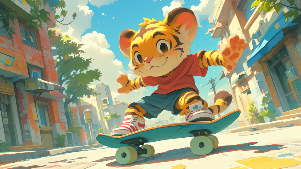 本作品内容为可爱老虎玩滑板插画, 格式为 jpg, 大小3 MB, 图片尺寸为2912 x 1632, 源文件无水印, 欢迎使用熊猫办公。 如认为平台内容涉嫌侵权,可通过邮件:tousu@tukuppt.com提出书面通知,我们将及时处理。