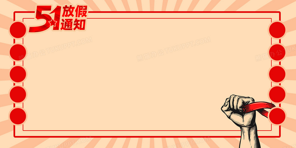 本作品内容为横版五一放假通知背景, 格式为 psd, 大小10 MB, 图片尺寸为4724 x 2362, 作品中背景图片无需修改, 源文件无水印,可以直接使用, 欢迎使用熊猫办公。 如认为平台内容涉嫌侵权,可通过邮件:tousu@tukuppt.com提出书面通知,我们将及时处理。