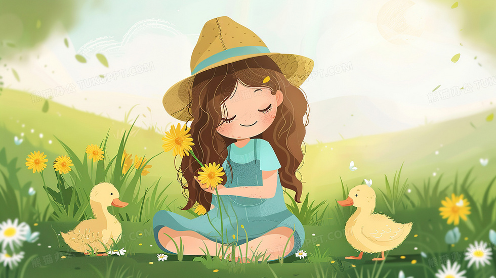 本作品内容为草坪上穿蓝色裙子得女孩和鸭子插画, 格式为 jpg, 大小3 MB, 图片尺寸为2912 x 1632, 源文件无水印, 欢迎使用熊猫办公。 如认为平台内容涉嫌侵权,可通过邮件:tousu@tukuppt.com提出书面通知,我们将及时处理。