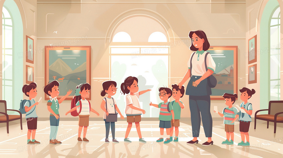 本作品内容为老师带领孩子们参观博物馆展览馆插画, 格式为 jpg, 大小2 MB, 图片尺寸为2912 x 1632, 源文件无水印, 欢迎使用熊猫办公。 如认为平台内容涉嫌侵权,可通过邮件:tousu@tukuppt.com提出书面通知,我们将及时处理。