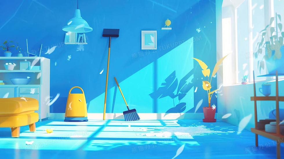 本作品内容为摆放着清洁工具的客厅插画, 格式为 jpg, 大小3 MB, 图片尺寸为2912 x 1632, 源文件无水印, 欢迎使用熊猫办公。 如认为平台内容涉嫌侵权,可通过邮件:tousu@tukuppt.com提出书面通知,我们将及时处理。
