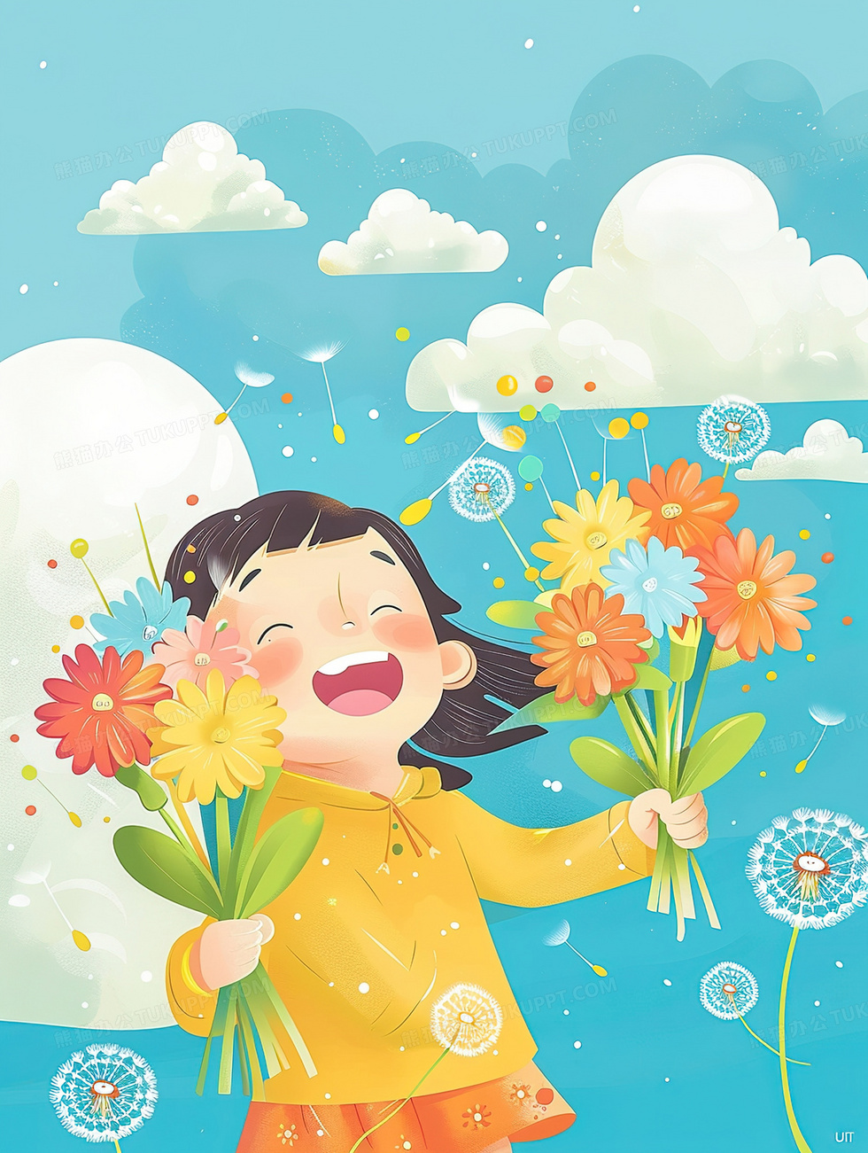 本作品内容为拿着花束开心的小女孩插画, 格式为 jpg, 大小3 MB, 图片尺寸为1856 x 2464, 源文件无水印, 欢迎使用熊猫办公。 如认为平台内容涉嫌侵权,可通过邮件:tousu@tukuppt.com提出书面通知,我们将及时处理。