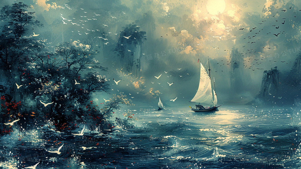 本作品内容为中国风波涛汹涌航行的小船插画, 格式为 jpg, 大小3 MB, 图片尺寸为2240 x 1256, 源文件无水印, 欢迎使用熊猫办公。 如认为平台内容涉嫌侵权,可通过邮件:tousu@tukuppt.com提出书面通知,我们将及时处理。