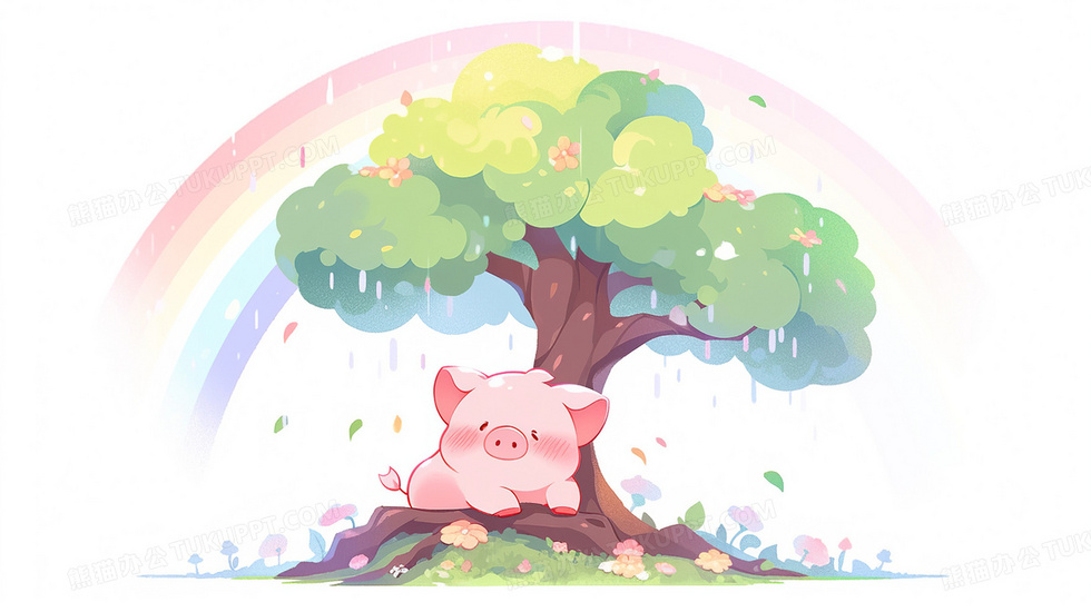 雨中彩虹红树下卡爱的小猪趴在树下插画