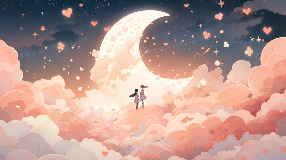 本作品内容为月光下彩云间两个可爱的女生一起许愿插画, 格式为 jpg, 大小3 MB, 图片尺寸为2912 x 1632, 源文件无水印, 欢迎使用熊猫办公。 如认为平台内容涉嫌侵权,可通过邮件:tousu@tukuppt.com提出书面通知,我们将及时处理。