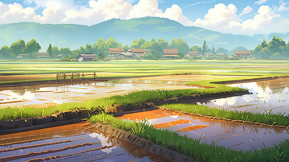 本作品内容为农村广阔平坦的水田风景插画, 格式为 jpg, 大小4 MB, 图片尺寸为2912 x 1632, 源文件无水印, 欢迎使用熊猫办公。 如认为平台内容涉嫌侵权,可通过邮件:tousu@tukuppt.com提出书面通知,我们将及时处理。