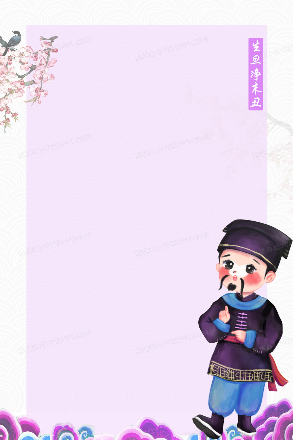 本作品内容为紫色古风京剧生旦净末丑合成背景, 格式为 psd, 大小30 MB, 图片尺寸为3543 x 5314, 作品中背景图片无需修改, 源文件无水印,可以直接使用, 欢迎使用熊猫办公。 如认为平台内容涉嫌侵权,可通过邮件:tousu@tukuppt.com提出书面通知,我们将及时处理。