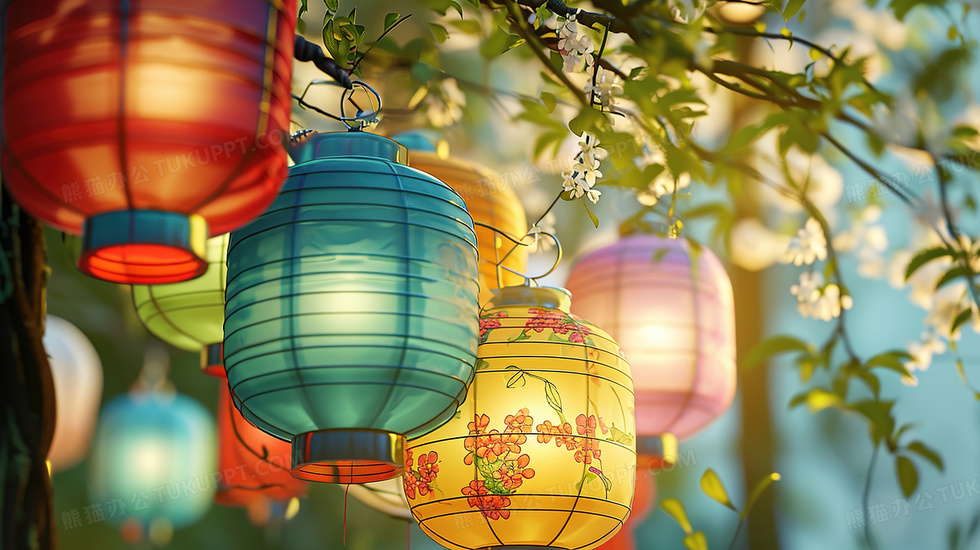 本作品内容为庭院中挂着的七彩灯笼插画, 格式为 jpg, 大小3 MB, 图片尺寸为2912 x 1632, 源文件无水印, 欢迎使用熊猫办公。 如认为平台内容涉嫌侵权,可通过邮件:tousu@tukuppt.com提出书面通知,我们将及时处理。