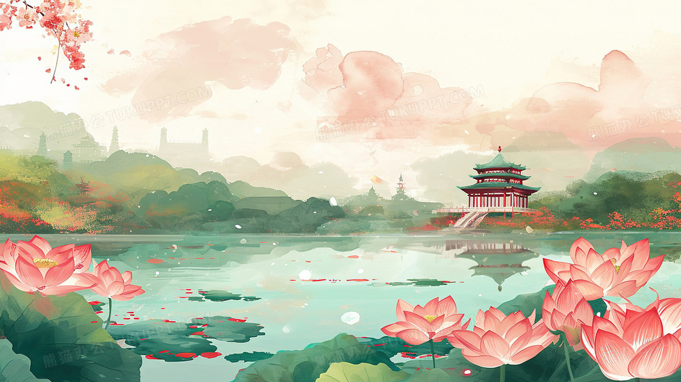本作品内容为唯美中国风荷花湖心亭插画, 格式为 jpg, 大小3 MB, 图片尺寸为2912 x 1632, 源文件无水印, 欢迎使用熊猫办公。 如认为平台内容涉嫌侵权,可通过邮件:tousu@tukuppt.com提出书面通知,我们将及时处理。