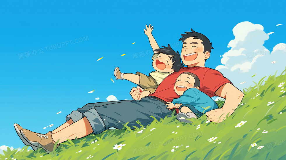 本作品内容为躺在草坪上玩耍的爸爸和男孩插画, 格式为 jpg, 大小2 MB, 图片尺寸为2912 x 1632, 源文件无水印, 欢迎使用熊猫办公。 如认为平台内容涉嫌侵权,可通过邮件:tousu@tukuppt.com提出书面通知,我们将及时处理。