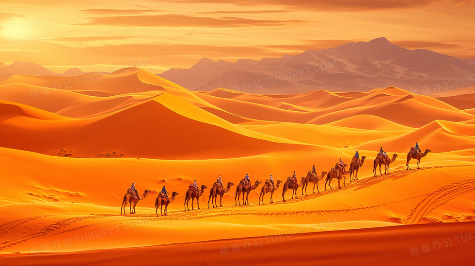 本作品内容为橙色沙漠上的驼队背景, 格式为 jpg, 大小3 MB, 图片尺寸为2912 x 1632, 作品中背景图片无需修改, 源文件无水印,可以直接使用, 欢迎使用熊猫办公。 如认为平台内容涉嫌侵权,可通过邮件:tousu@tukuppt.com提出书面通知,我们将及时处理。