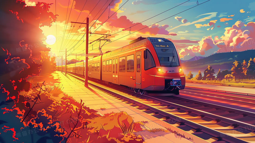 本作品内容为晚霞下行驶进站的交通火车插画, 格式为 jpg, 大小3 MB, 图片尺寸为2912 x 1632, 源文件无水印, 欢迎使用熊猫办公。 如认为平台内容涉嫌侵权,可通过邮件:tousu@tukuppt.com提出书面通知,我们将及时处理。