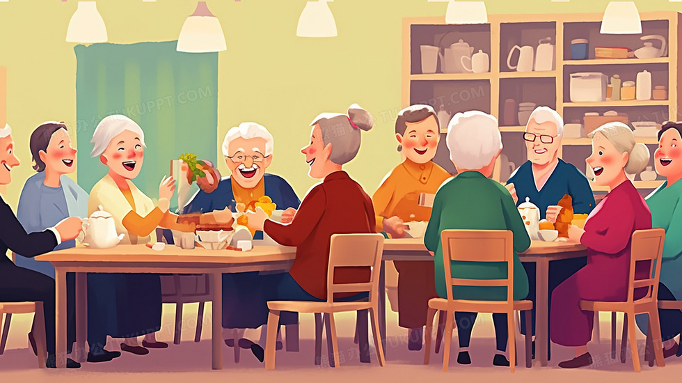 本作品内容为老年人在一起聚餐插画, 格式为 jpg, 大小2 MB, 图片尺寸为2912 x 1632, 源文件无水印, 欢迎使用熊猫办公。 如认为平台内容涉嫌侵权,可通过邮件:tousu@tukuppt.com提出书面通知,我们将及时处理。