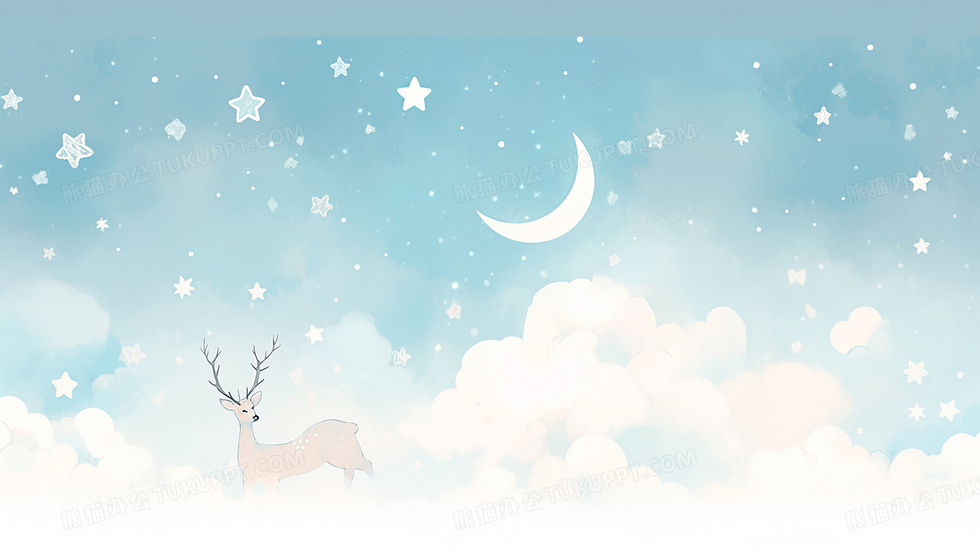 本作品内容为淡蓝色背景月亮下的卡通麋鹿插画, 格式为 jpg, 大小2 MB, 图片尺寸为2912 x 1632, 源文件无水印, 欢迎使用熊猫办公。 如认为平台内容涉嫌侵权,可通过邮件:tousu@tukuppt.com提出书面通知,我们将及时处理。