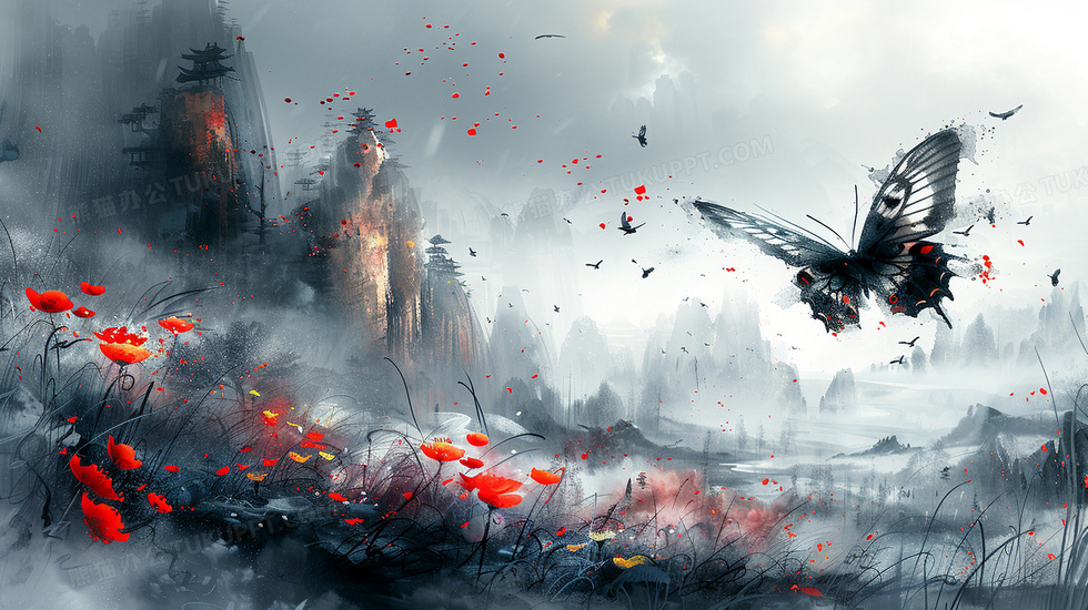 本作品内容为写意水墨蝴蝶插画, 格式为 jpg, 大小3 MB, 图片尺寸为2913 x 1633, 源文件无水印, 欢迎使用熊猫办公。 如认为平台内容涉嫌侵权,可通过邮件:tousu@tukuppt.com提出书面通知,我们将及时处理。