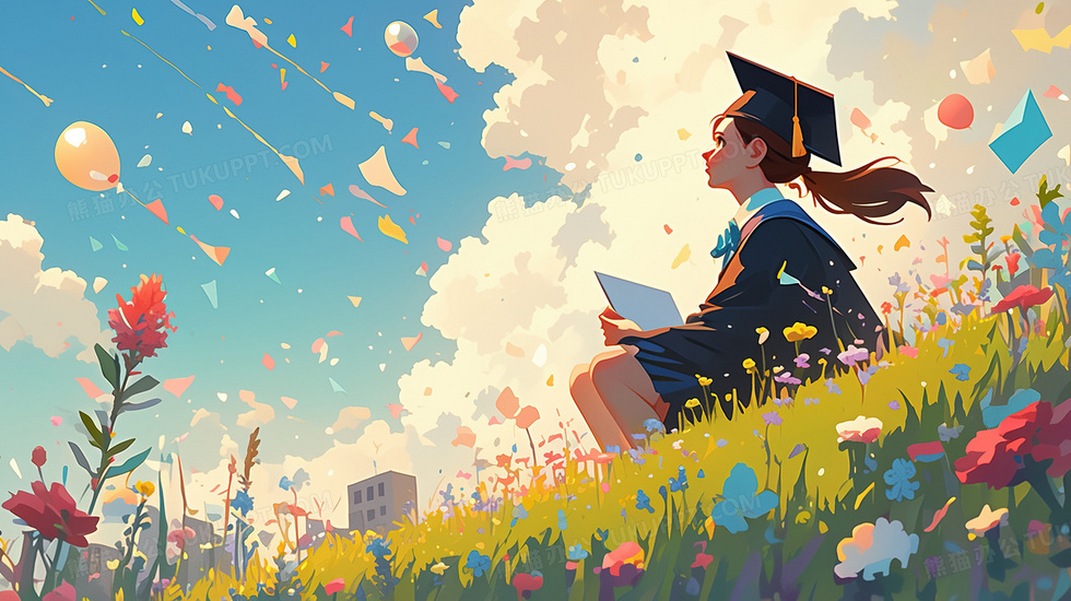 本作品内容为大学毕业草地上穿学士服的女孩插画, 格式为 jpg, 大小3 MB, 图片尺寸为2912 x 1632, 源文件无水印, 欢迎使用熊猫办公。 如认为平台内容涉嫌侵权,可通过邮件:tousu@tukuppt.com提出书面通知,我们将及时处理。