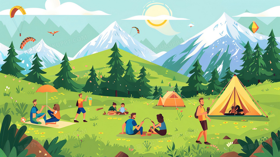 本作品内容为夏日野营度假插画, 格式为 jpg, 大小3 MB, 图片尺寸为2912 x 1632, 源文件无水印, 欢迎使用熊猫办公。 如认为平台内容涉嫌侵权,可通过邮件:tousu@tukuppt.com提出书面通知,我们将及时处理。
