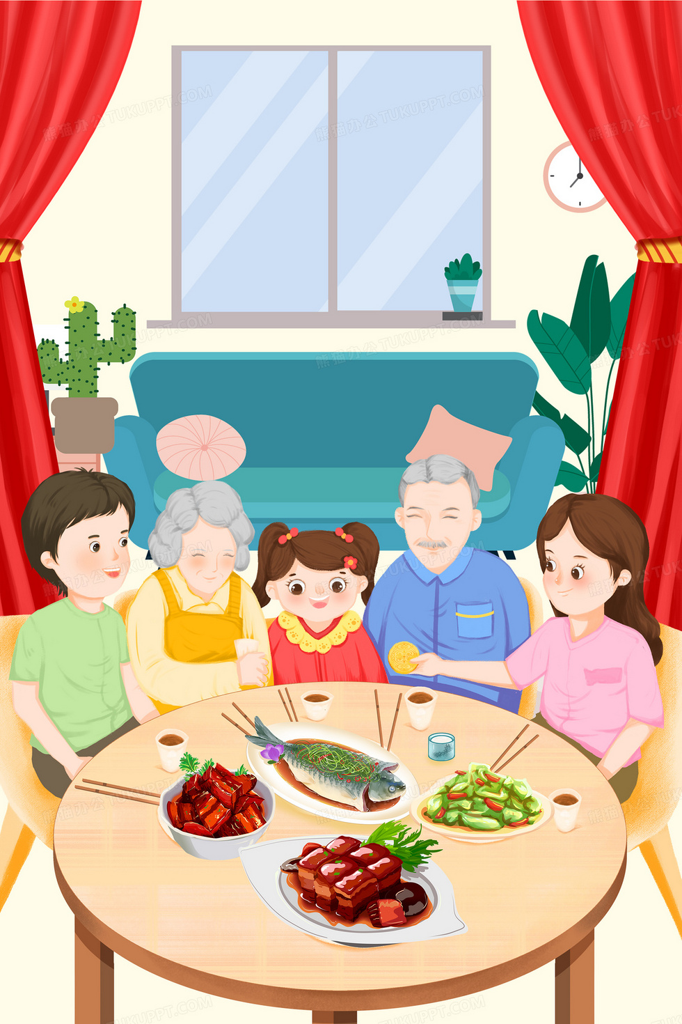 本作品内容为除夕春节阖家团圆年夜饭插画手绘背景, 格式为 psd, 大小54 MB, 图片尺寸为3543 x 5315, 作品中背景图片无需修改, 源文件无水印,可以直接使用, 欢迎使用熊猫办公。 如认为平台内容涉嫌侵权,可通过邮件:tousu@tukuppt.com提出书面通知,我们将及时处理。