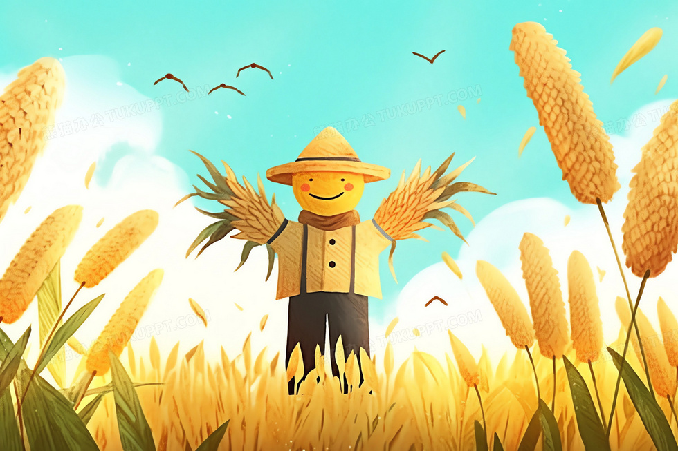 本作品内容为卡通风蓝天下在麦田里的稻草人插画, 格式为 jpg, 大小4 MB, 图片尺寸为2688 x 1792, 源文件无水印, 欢迎使用熊猫办公。 如认为平台内容涉嫌侵权,可通过邮件:tousu@tukuppt.com提出书面通知,我们将及时处理。