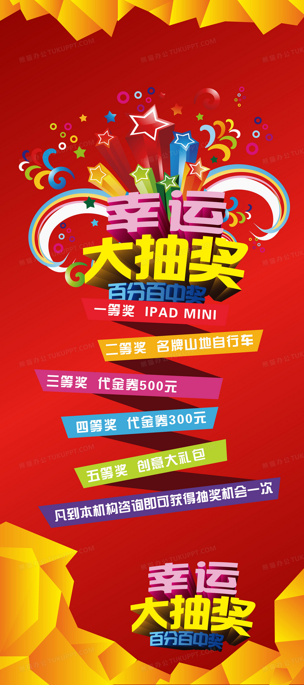 本作品内容为彩色礼盒红底抽奖背景素材, 格式为 ai, 图片尺寸为2953 x 6644, 作品中背景图片无需修改, 源文件无水印,可以直接使用, 欢迎使用熊猫办公。 如认为平台内容涉嫌侵权,可通过邮件:tousu@tukuppt.com提出书面通知,我们将及时处理。