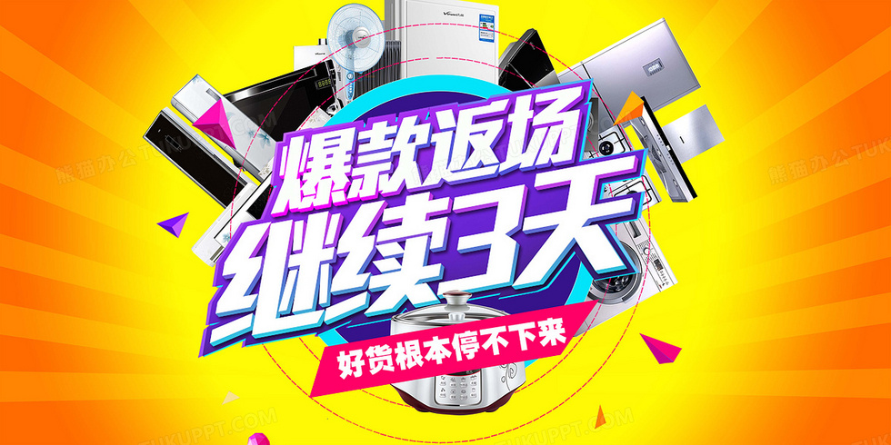 本作品内容为淘宝爆款返场促销海报背景模板, 格式为 psd, 图片尺寸为5087 x 2543, 作品中背景图片无需修改, 源文件无水印,可以直接使用, 欢迎使用熊猫办公。 如认为平台内容涉嫌侵权,可通过邮件:tousu@tukuppt.com提出书面通知,我们将及时处理。