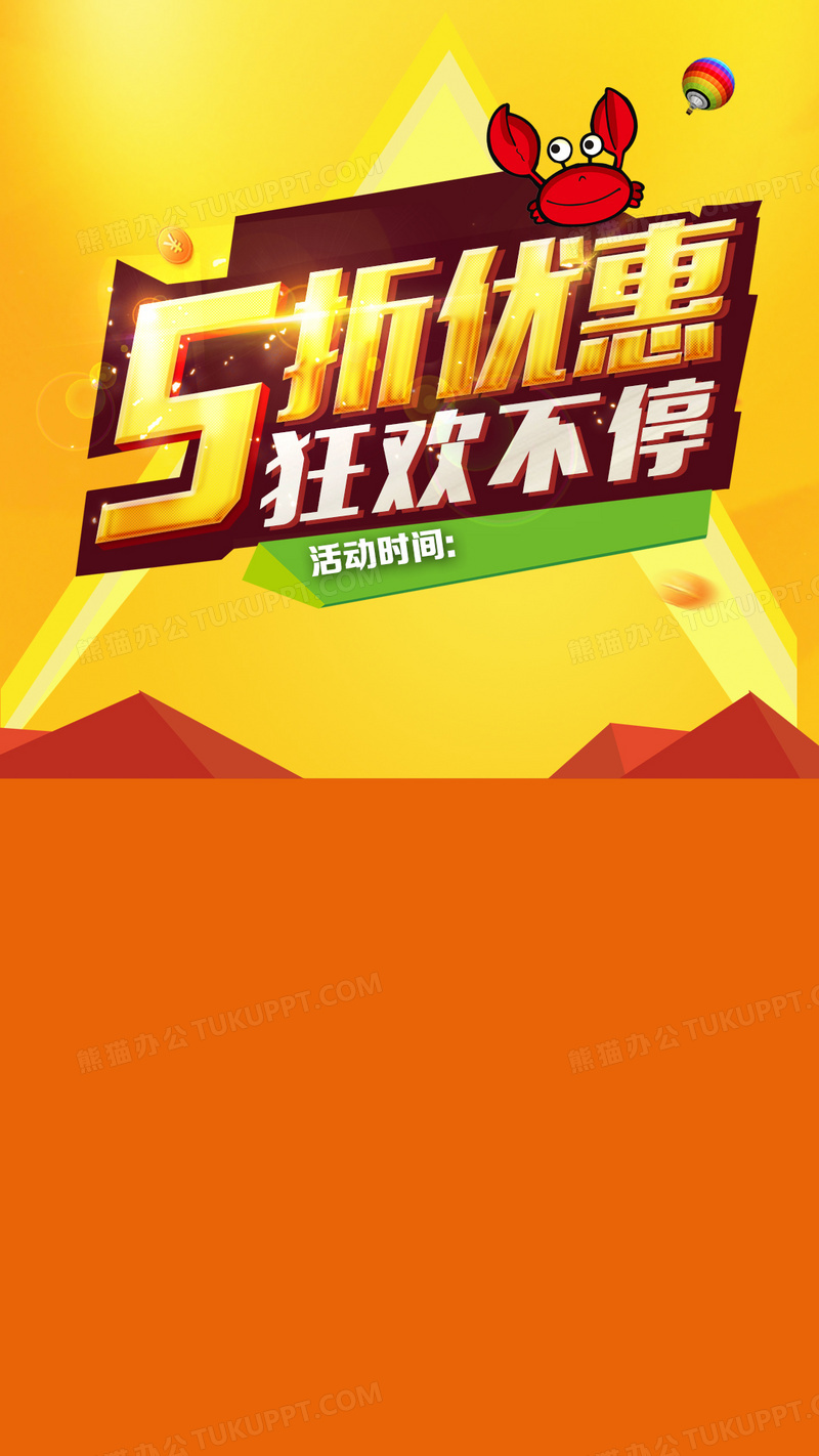 本作品内容为五折优惠美食活动H5背景, 格式为 psd, 图片尺寸为1080 x 1920, 作品中背景图片无需修改, 源文件无水印,可以直接使用, 欢迎使用熊猫办公。 如认为平台内容涉嫌侵权,可通过邮件:tousu@tukuppt.com提出书面通知,我们将及时处理。