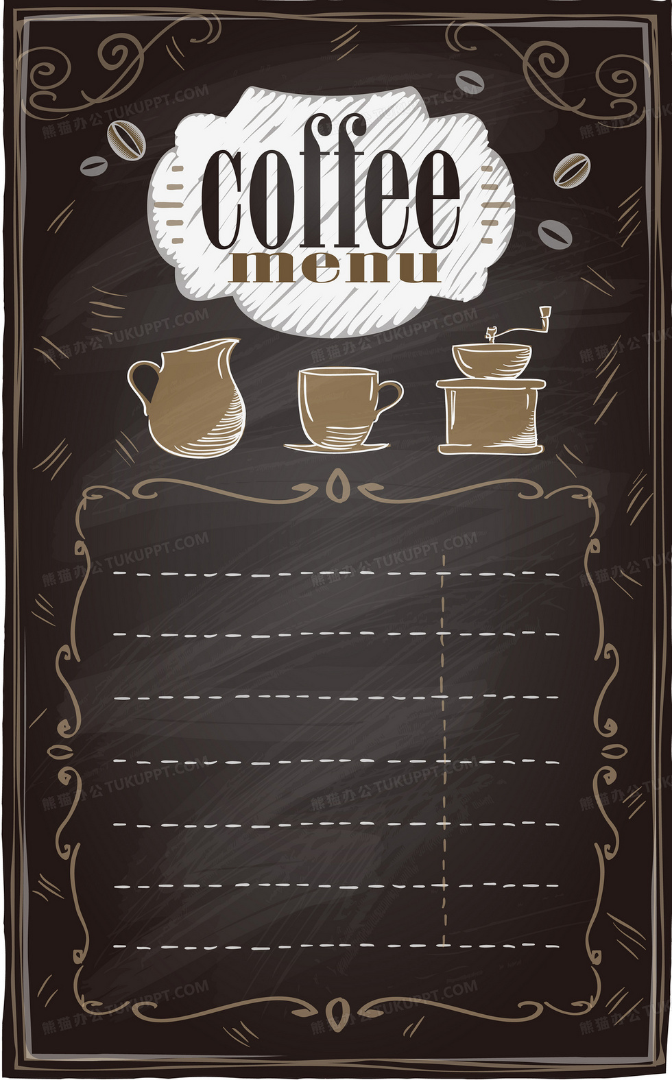 本作品内容为大气咖啡店咖啡单海报背景素材, 格式为 psd, 图片尺寸为2606 x 4190, 作品中背景图片无需修改, 源文件无水印,可以直接使用, 欢迎使用熊猫办公。 如认为平台内容涉嫌侵权,可通过邮件:tousu@tukuppt.com提出书面通知,我们将及时处理。