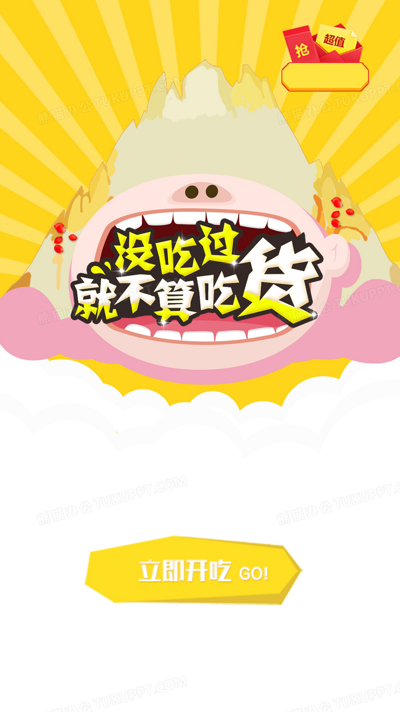 本作品内容为吃货APP引导页面, 格式为 psd, 图片尺寸为1080 x 1920, 作品中背景图片无需修改, 源文件无水印,可以直接使用, 欢迎使用熊猫办公。 如认为平台内容涉嫌侵权,可通过邮件:tousu@tukuppt.com提出书面通知,我们将及时处理。