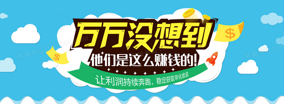 本作品内容为万万没想到 赚钱 收益, 格式为 psd, 图片尺寸为1920 x 700, 作品中背景图片无需修改, 源文件无水印,可以直接使用, 欢迎使用熊猫办公。 如认为平台内容涉嫌侵权,可通过邮件:tousu@tukuppt.com提出书面通知,我们将及时处理。