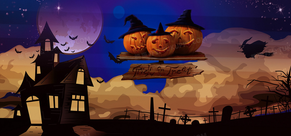 本作品内容为万圣节海报, 格式为 psd, 图片尺寸为1920 x 900, 作品中背景图片无需修改, 源文件无水印,可以直接使用, 欢迎使用熊猫办公。 如认为平台内容涉嫌侵权,可通过邮件:tousu@tukuppt.com提出书面通知,我们将及时处理。