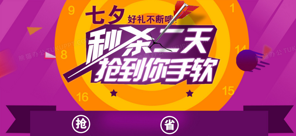 本作品内容为七夕秒杀两天海报, 格式为 psd, 图片尺寸为1920 x 883, 作品中背景图片无需修改, 源文件无水印,可以直接使用, 欢迎使用熊猫办公。 如认为平台内容涉嫌侵权,可通过邮件:tousu@tukuppt.com提出书面通知,我们将及时处理。