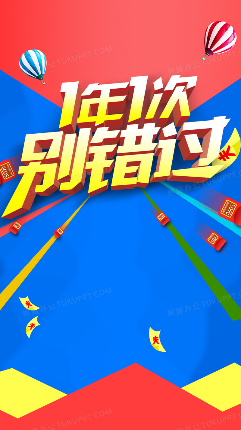 本作品内容为一年一次别错过促销psd素材, 格式为 psd, 图片尺寸为1080 x 1920, 作品中背景图片无需修改, 源文件无水印,可以直接使用, 欢迎使用熊猫办公。 如认为平台内容涉嫌侵权,可通过邮件:tousu@tukuppt.com提出书面通知,我们将及时处理。
