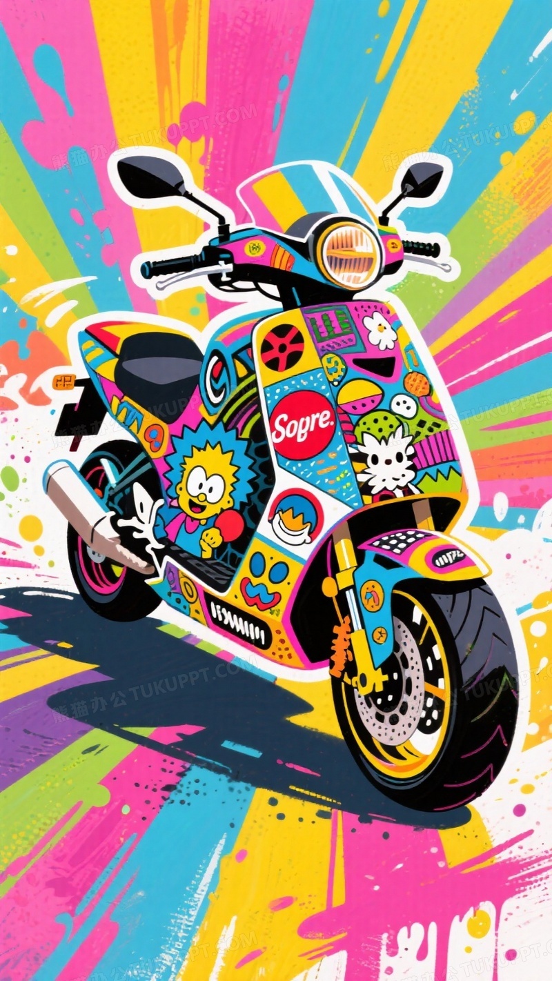 本作品内容为波普风格摩托车插画大胆的色彩和夸张的图形组合, 格式为 jpg, 大小1 MB, 图片尺寸为936 x 1664, 源文件无水印, 欢迎使用熊猫办公。 如认为平台内容涉嫌侵权,可通过邮件:tousu@tukuppt.com提出书面通知,我们将及时处理。
