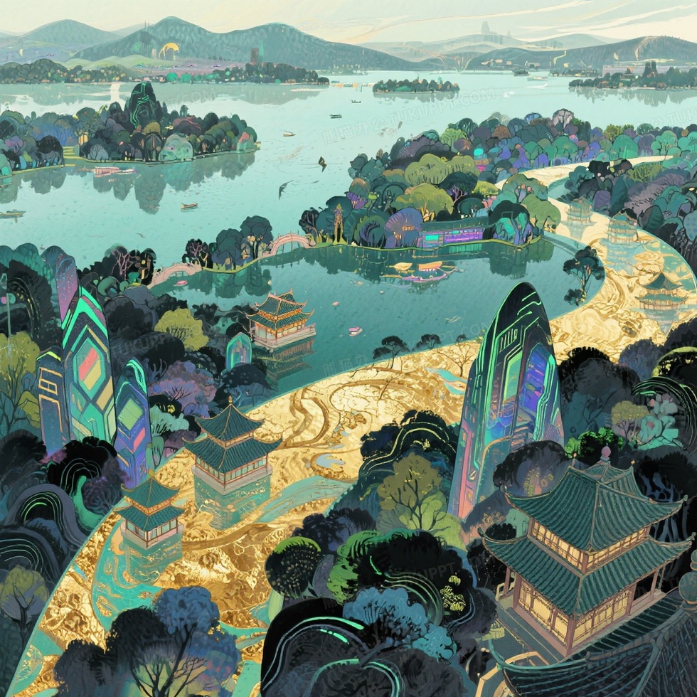 首页 > 插画 > 科技艺术 > 其他 > 具有奇幻色彩的杭州西湖插画