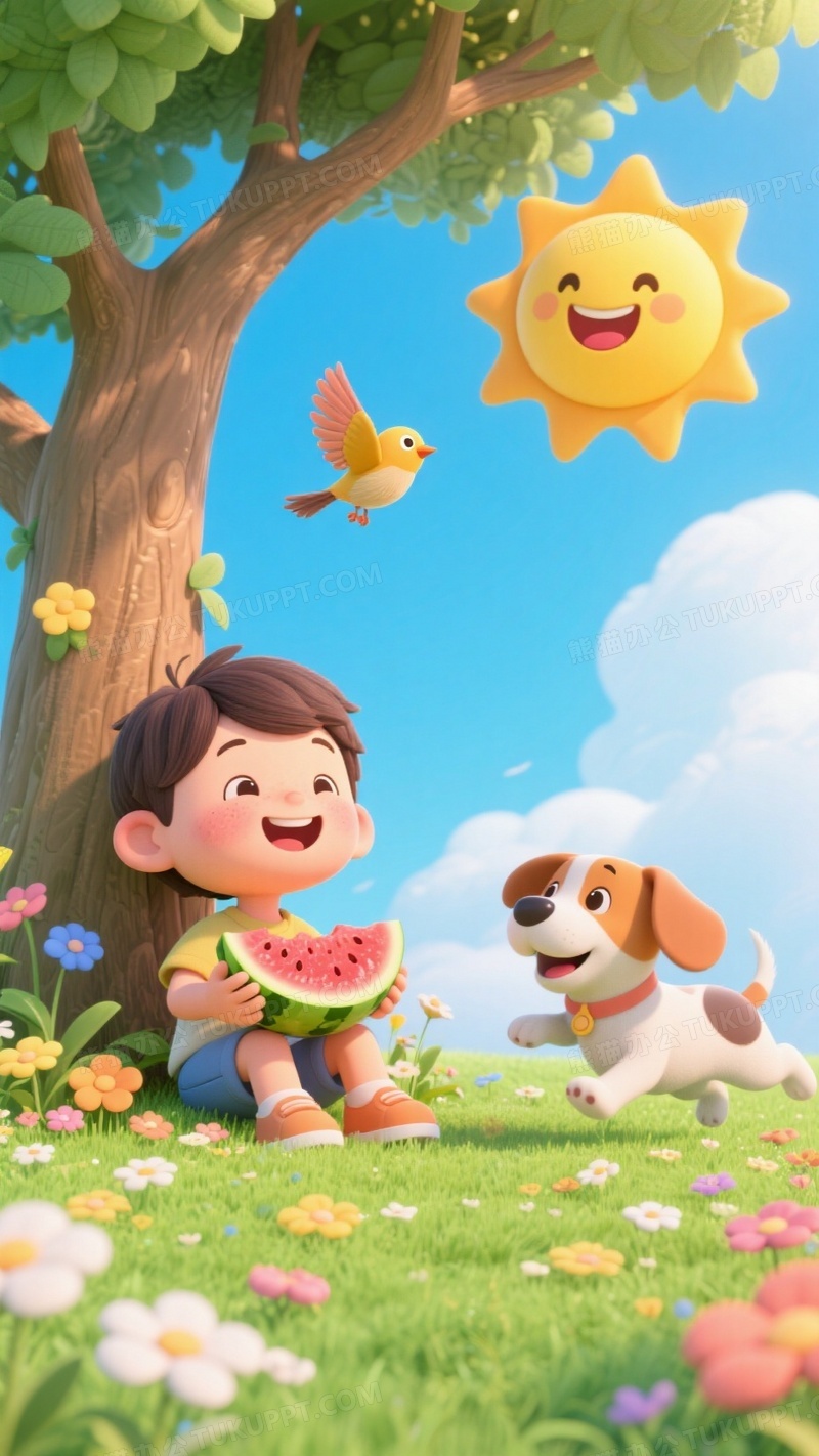 本作品内容为蓝天白云上的太阳公公笑咪咪小鸟在树上飞呀飞小朋友坐在树下草地上开心的吃西瓜小狗旁边汪汪跑着叫草地上花花真漂亮, 格式为 jpg, 大小1 MB, 图片尺寸为936 x 1664, 源文件无水印, 欢迎使用熊猫办公。 如认为平台内容涉嫌侵权,可通过邮件:tousu@tukuppt.com提出书面通知,我们将及时处理。