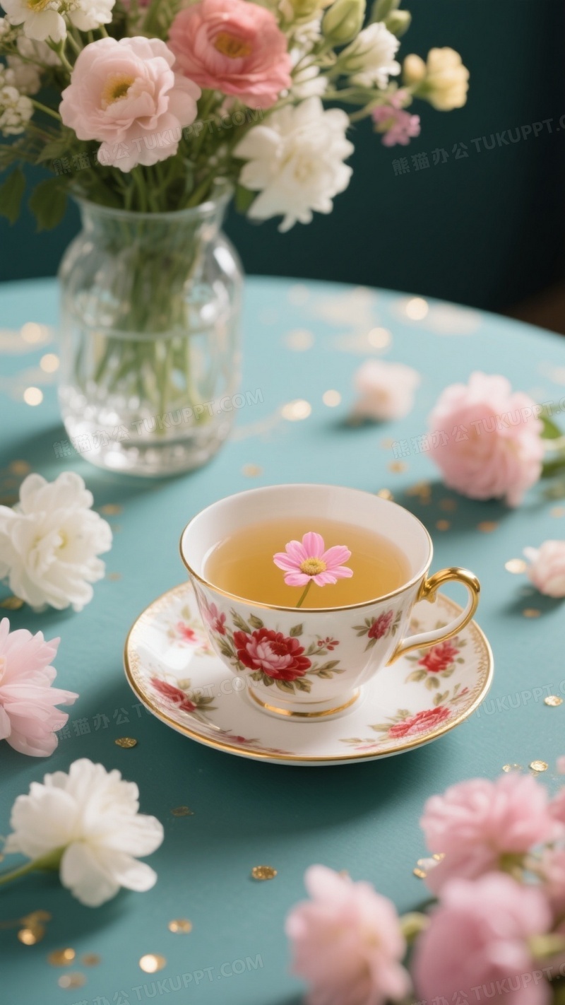 本作品内容为写实风格中景温馨花卉茶点场景, 格式为 jpg, 大小1 MB, 图片尺寸为936 x 1664, 源文件无水印, 欢迎使用熊猫办公。 如认为平台内容涉嫌侵权,可通过邮件:tousu@tukuppt.com提出书面通知,我们将及时处理。