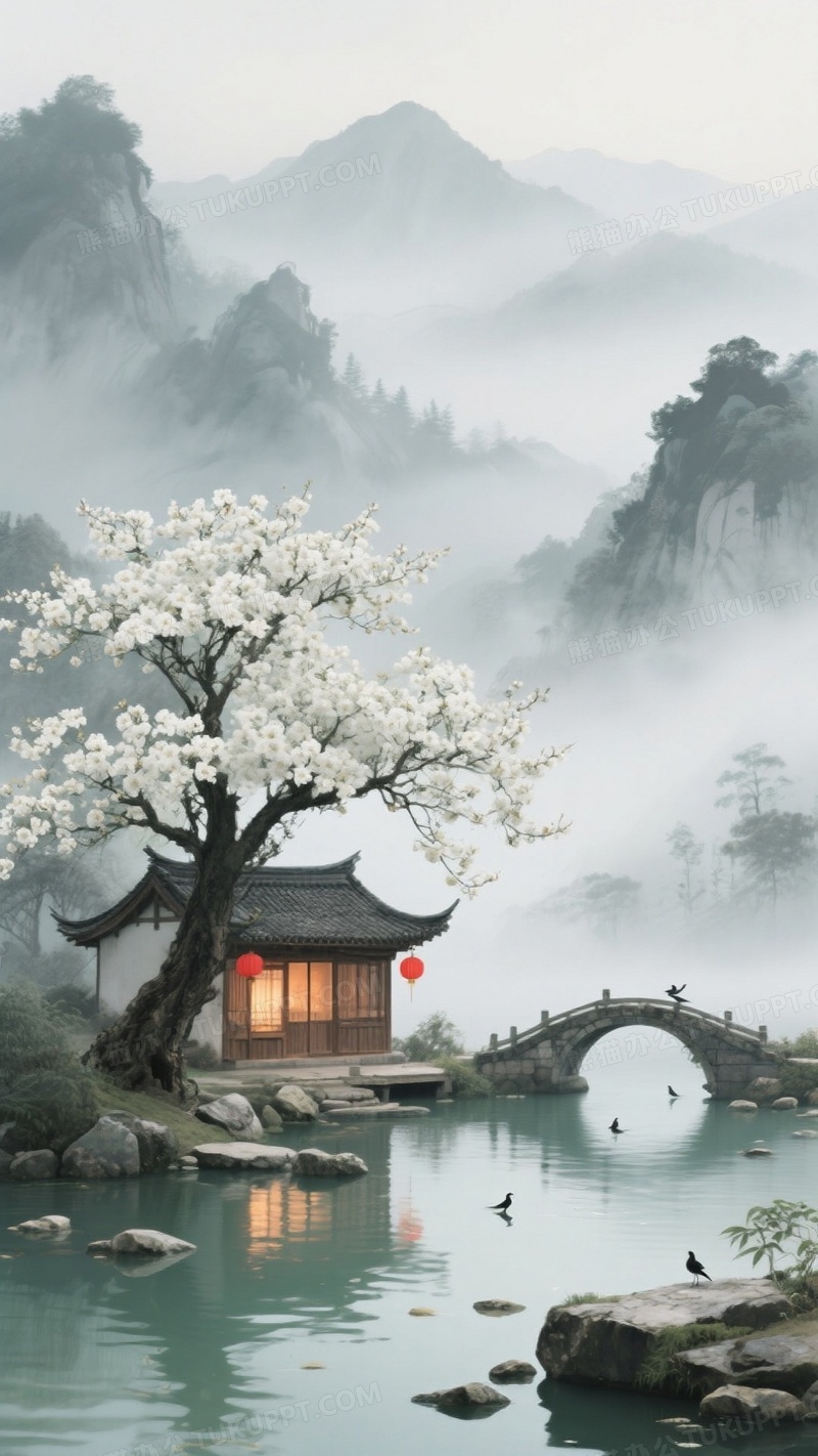 本作品内容为画面展现了一幅中式山水意境图, 格式为 jpg, 大小1 MB, 图片尺寸为936 x 1664, 源文件无水印, 欢迎使用熊猫办公。 如认为平台内容涉嫌侵权,可通过邮件:tousu@tukuppt.com提出书面通知,我们将及时处理。