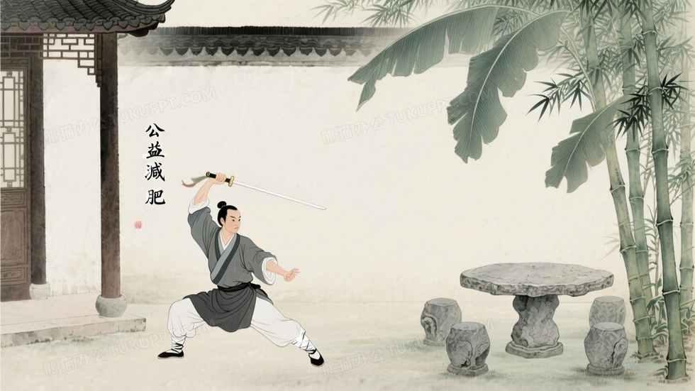 本作品内容为中国风公益插画一位武者在庭院中舞剑减肥, 格式为 jpg, 大小1 MB, 图片尺寸为1664 x 936, 源文件无水印, 欢迎使用熊猫办公。 如认为平台内容涉嫌侵权,可通过邮件:tousu@tukuppt.com提出书面通知,我们将及时处理。