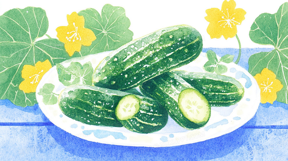 本作品内容为盘子里的新鲜蔬菜黄瓜插画, 格式为 jpg, 大小4 MB, 图片尺寸为2912 x 1632, 源文件无水印, 欢迎使用熊猫办公。 如认为平台内容涉嫌侵权,可通过邮件:tousu@tukuppt.com提出书面通知,我们将及时处理。