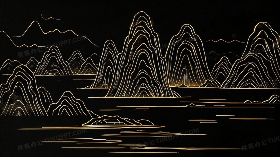本作品内容为线描山河平面绘图黑色底色上的金色雕刻, 格式为 jpg, 大小1 MB, 图片尺寸为2048 x 1152, 源文件无水印, 欢迎使用熊猫办公。 如认为平台内容涉嫌侵权,可通过邮件:tousu@tukuppt.com提出书面通知,我们将及时处理。