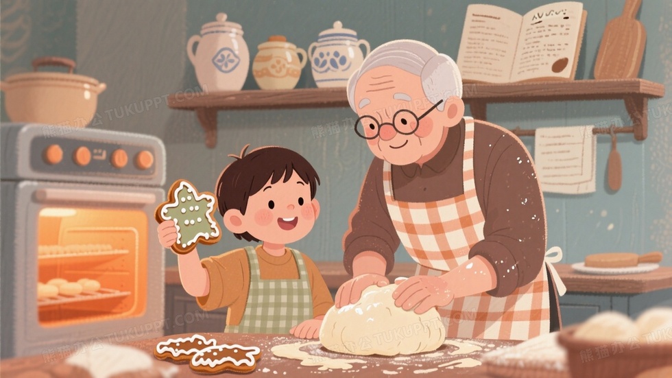 本作品内容为绘本风格祖孙烘焙场景, 格式为 jpg, 大小1 MB, 图片尺寸为1664 x 936, 源文件无水印, 欢迎使用熊猫办公。 如认为平台内容涉嫌侵权,可通过邮件:tousu@tukuppt.com提出书面通知,我们将及时处理。