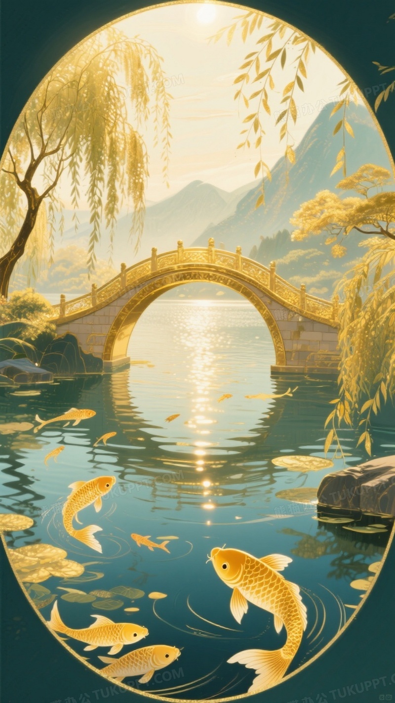 本作品内容为好看的国潮山水插画鎏金的拱桥横跨在波光粼粼的湖面, 格式为 jpg, 大小1 MB, 图片尺寸为936 x 1664, 源文件无水印, 欢迎使用熊猫办公。 如认为平台内容涉嫌侵权,可通过邮件:tousu@tukuppt.com提出书面通知,我们将及时处理。