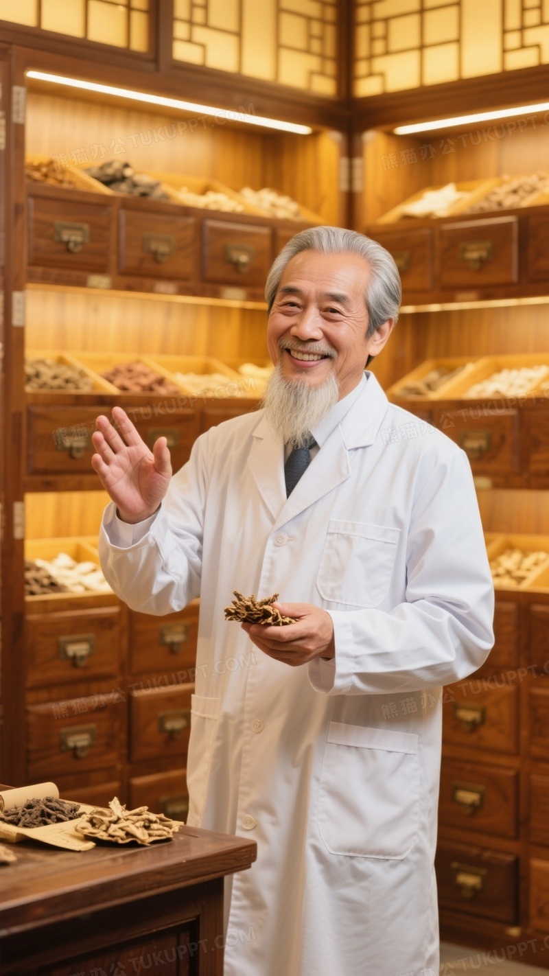 本作品内容为白大褂的长胡子老中医在中药房内手持中药材讲解, 格式为 jpg, 大小1 MB, 图片尺寸为936 x 1664, 源文件无水印, 欢迎使用熊猫办公。 如认为平台内容涉嫌侵权,可通过邮件:tousu@tukuppt.com提出书面通知,我们将及时处理。
