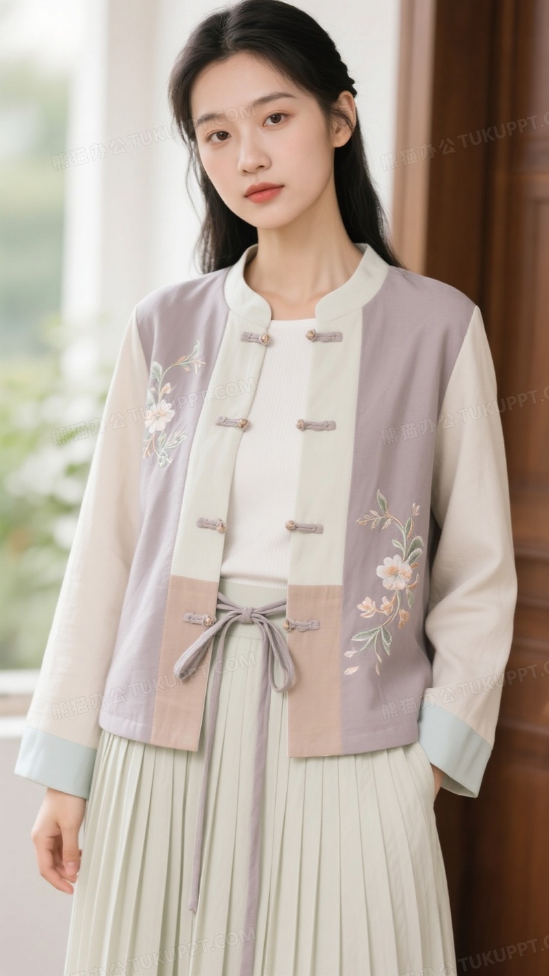 本作品内容为拼色盘扣外套刺绣单排扣上衣搭配绑带百褶裙, 格式为 jpg, 大小1 MB, 图片尺寸为936 x 1664, 源文件无水印, 欢迎使用熊猫办公。 如认为平台内容涉嫌侵权,可通过邮件:tousu@tukuppt.com提出书面通知,我们将及时处理。