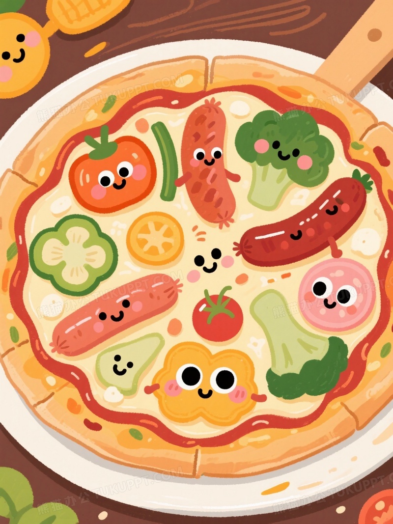 本作品内容为一个可爱的披萨上面各种蔬菜和香肠拟人化栩栩如生, 格式为 jpg, 大小1 MB, 图片尺寸为1104 x 1472, 源文件无水印, 欢迎使用熊猫办公。 如认为平台内容涉嫌侵权,可通过邮件:tousu@tukuppt.com提出书面通知,我们将及时处理。