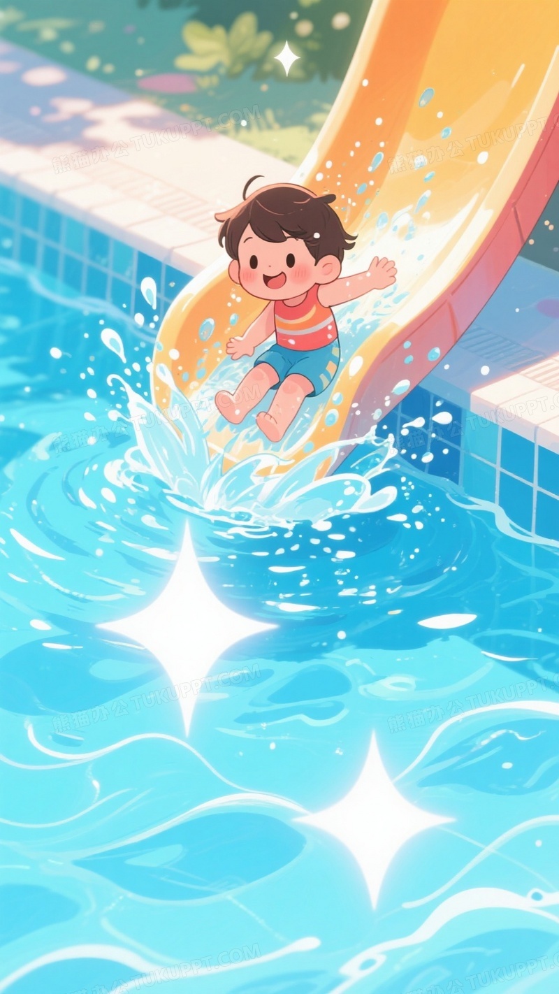 本作品内容为卡通插画风格泳池中一位可爱儿童从滑梯滑落, 格式为 jpg, 大小1 MB, 图片尺寸为936 x 1664, 源文件无水印, 欢迎使用熊猫办公。 如认为平台内容涉嫌侵权,可通过邮件:tousu@tukuppt.com提出书面通知,我们将及时处理。