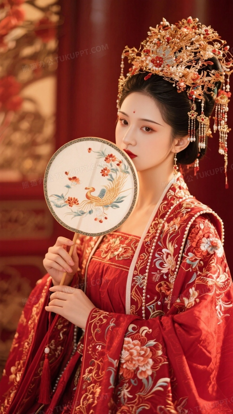 本作品内容为十里红妆凤冠霞帔手持圆形遮面扇子, 格式为 jpg, 大小1 MB, 图片尺寸为936 x 1664, 源文件无水印, 欢迎使用熊猫办公。 如认为平台内容涉嫌侵权,可通过邮件:tousu@tukuppt.com提出书面通知,我们将及时处理。