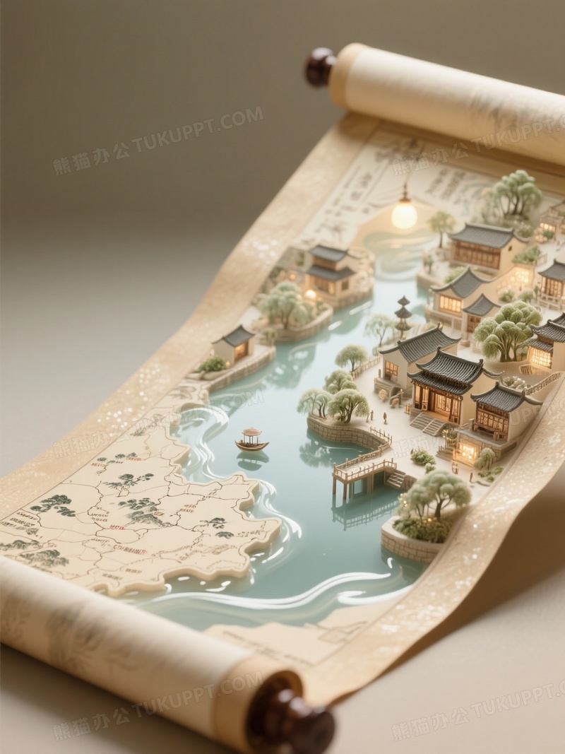 本作品内容为一副打开的卷轴里面的微景观, 格式为 jpg, 大小1 MB, 图片尺寸为1104 x 1472, 源文件无水印, 欢迎使用熊猫办公。 如认为平台内容涉嫌侵权,可通过邮件:tousu@tukuppt.com提出书面通知,我们将及时处理。