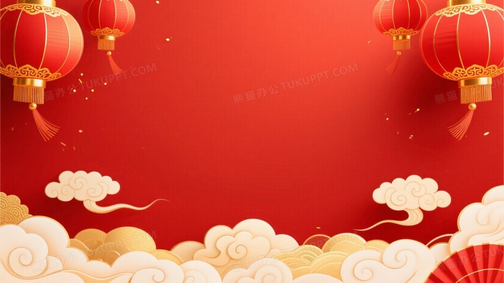 本作品内容为中国春节红金背景底部是装饰着浮云, 格式为 jpg, 大小1 MB, 图片尺寸为1664 x 936, 作品中背景图片无需修改, 源文件无水印,可以直接使用, 欢迎使用熊猫办公。 如认为平台内容涉嫌侵权,可通过邮件:tousu@tukuppt.com提出书面通知,我们将及时处理。